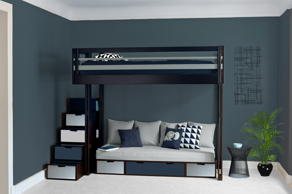 Dans le contexte de « Terra Cosmos », le colvert Loggia enrichit la palette en ajoutant une note de profondeur avec sa nuance très marquée. Il complète parfaitement les teintes terreuses comme le sable et l’ocre, tout en offrant un contraste raffiné avec les nuances célestes. Le colvert Loggia est idéal pour vos aménagements gain de place, que ce soit en mezzanines ou lits escamotables.