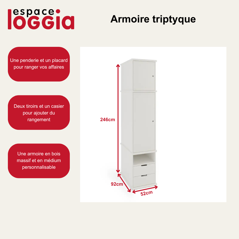 Son principal atout reste sa modularité. L’armoire triptyque s’ouvre partiellement ou complètement selon la situation. Vous accédez rapidement à vos vêtements, linge ou accessoires, tout en conservant une impression d’ordre. En la refermant, vous libérez l’espace et conservez une ambiance épurée.