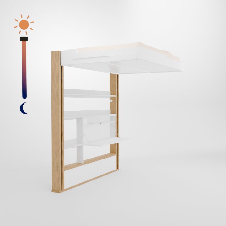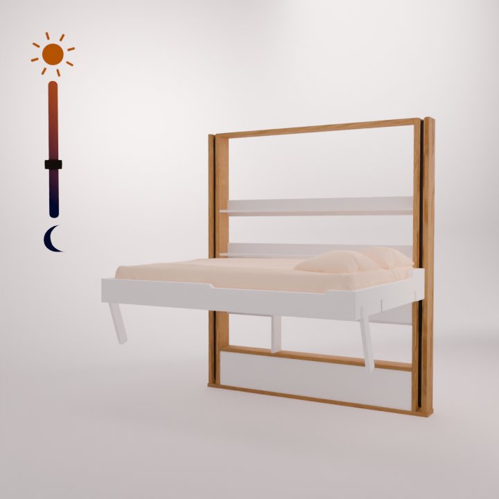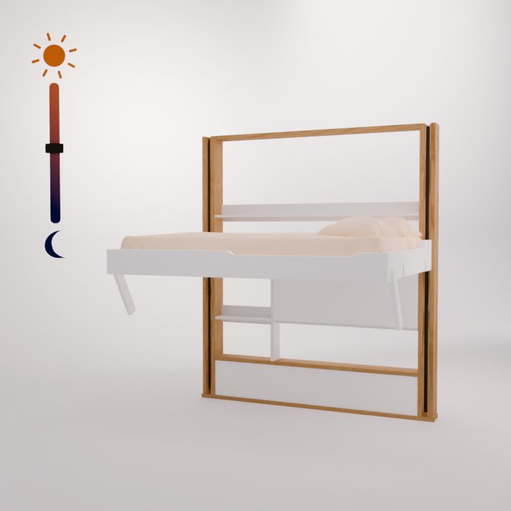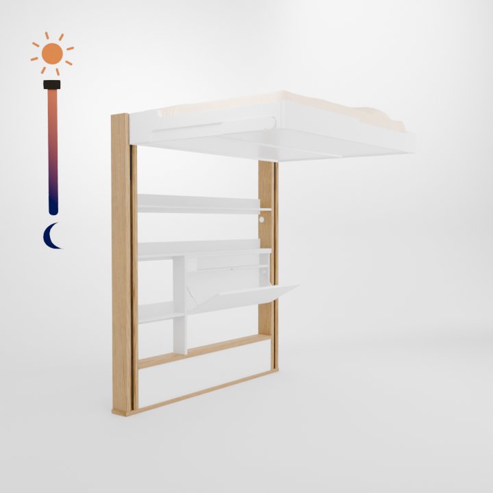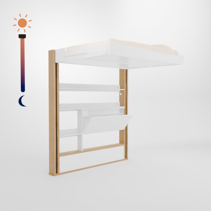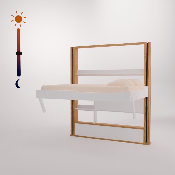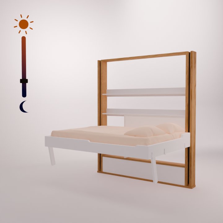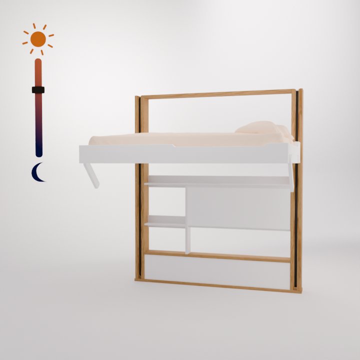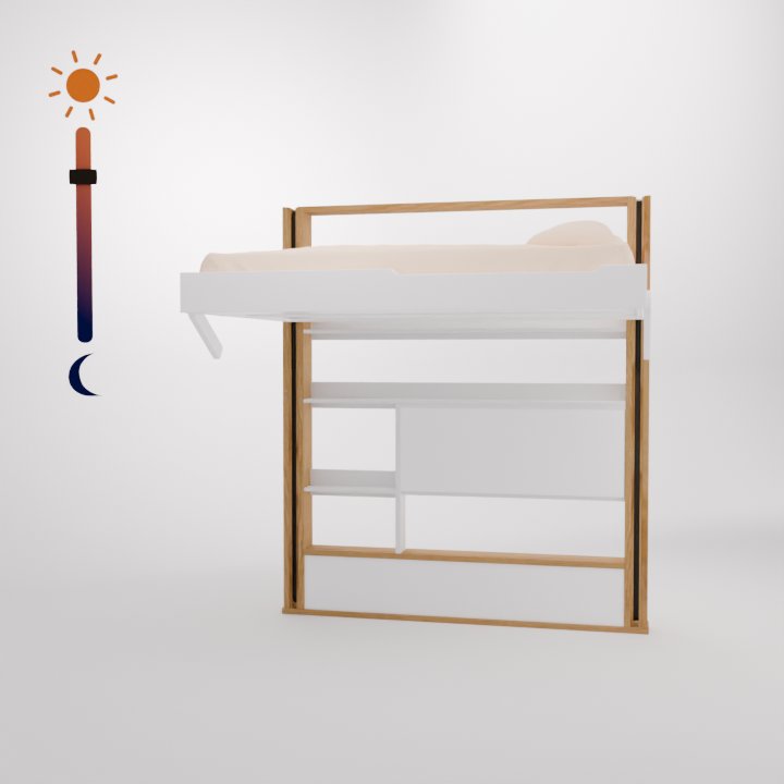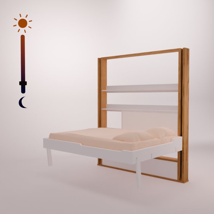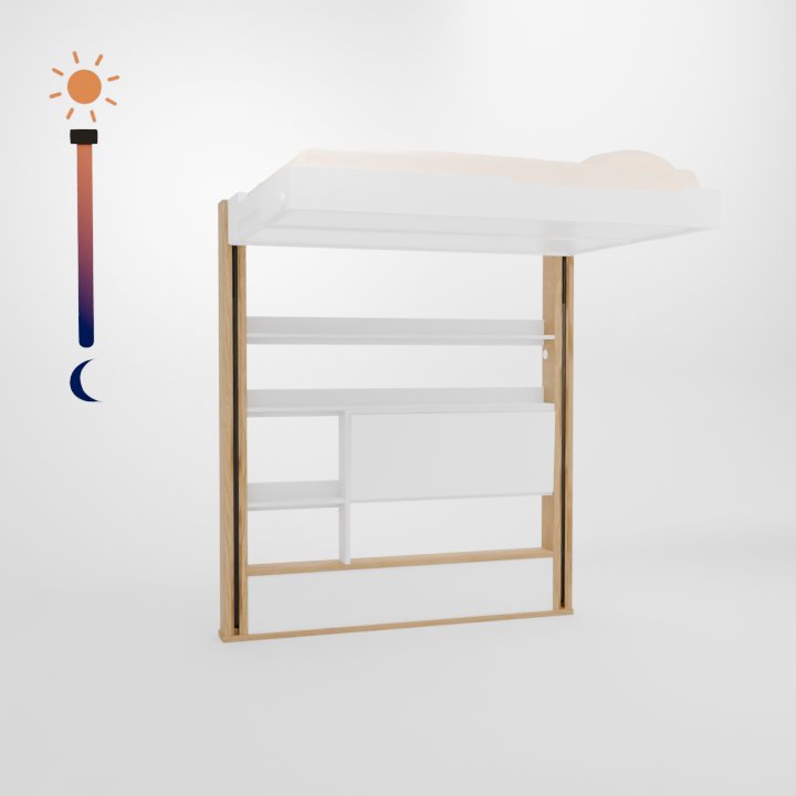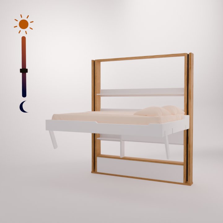 Une fois relevé, le lit escamotable éclectique libère un espace au sol entièrement modulable. Cette surface dégagée peut accueillir un bureau, un coin lecture, un espace jeux ou un canapé selon vos besoins. Grâce à sa conception polyvalente, il permet de transformer une même pièce en espace multifonction sans compromis sur le confort.