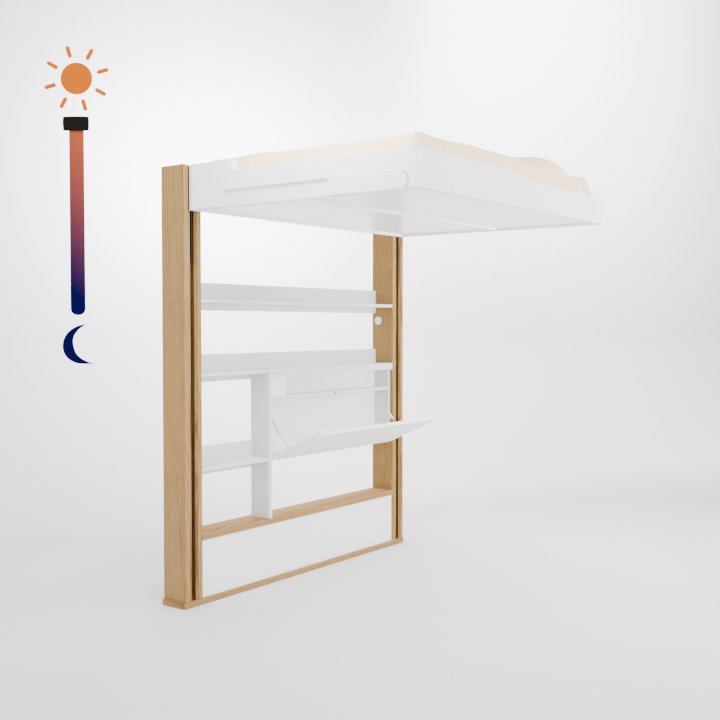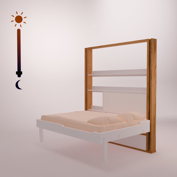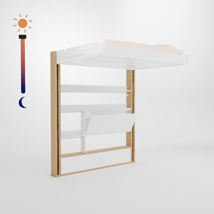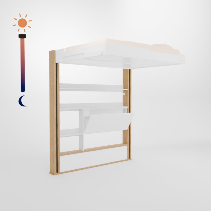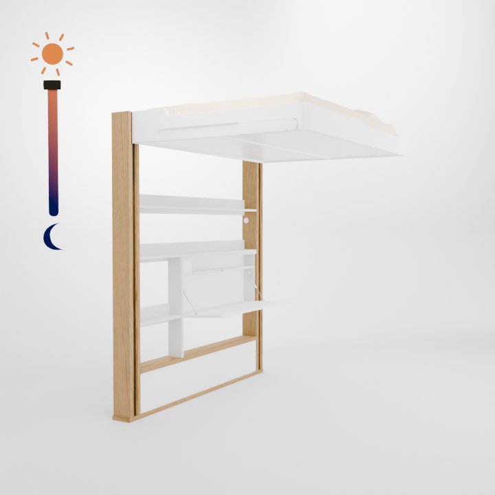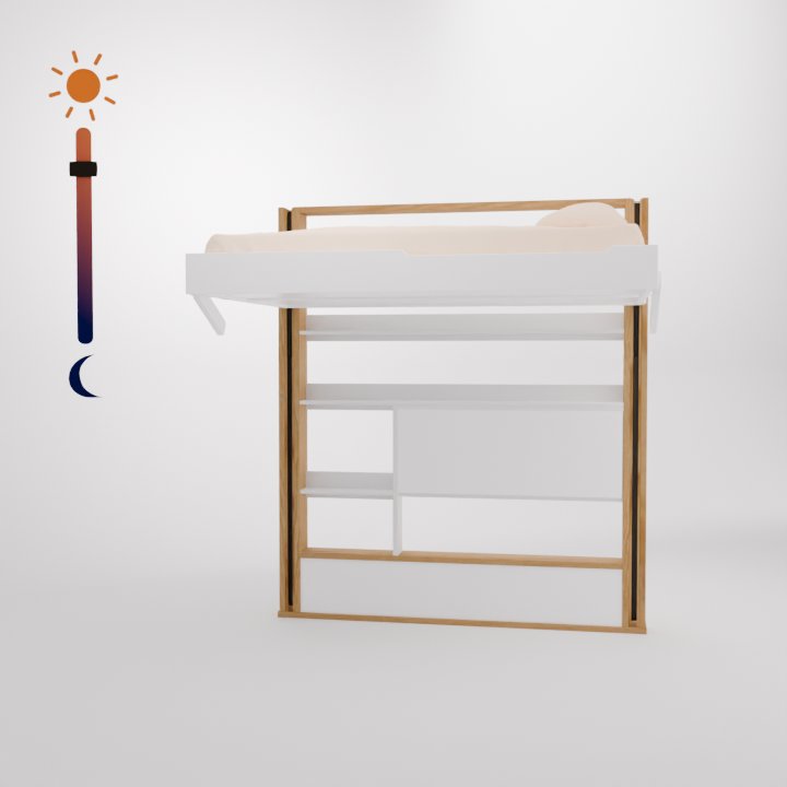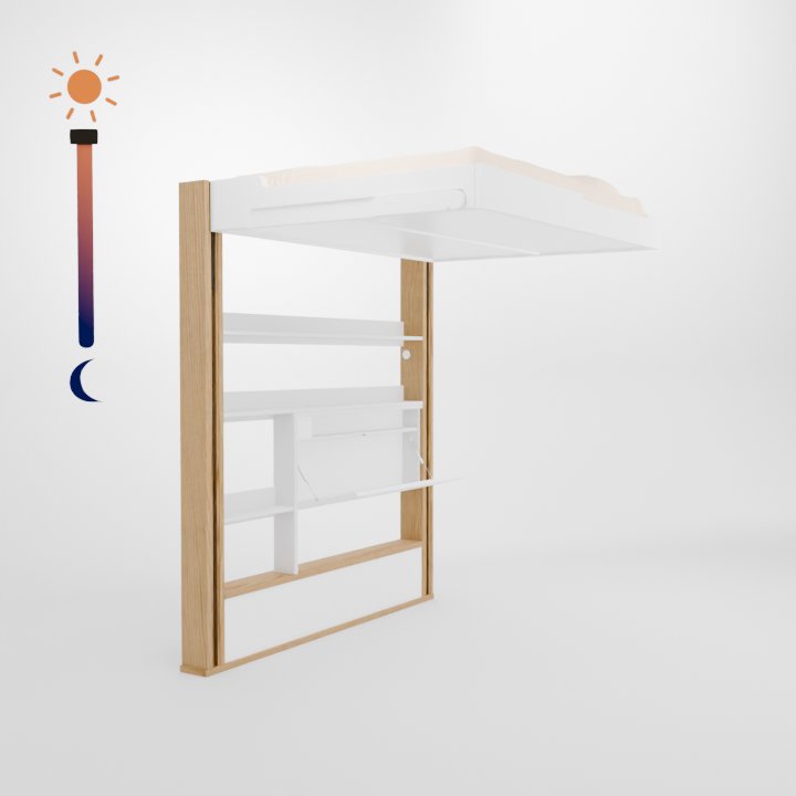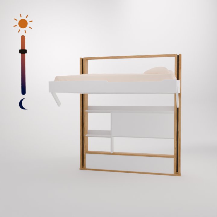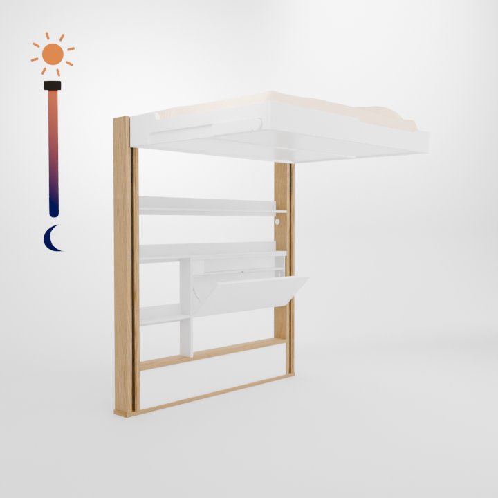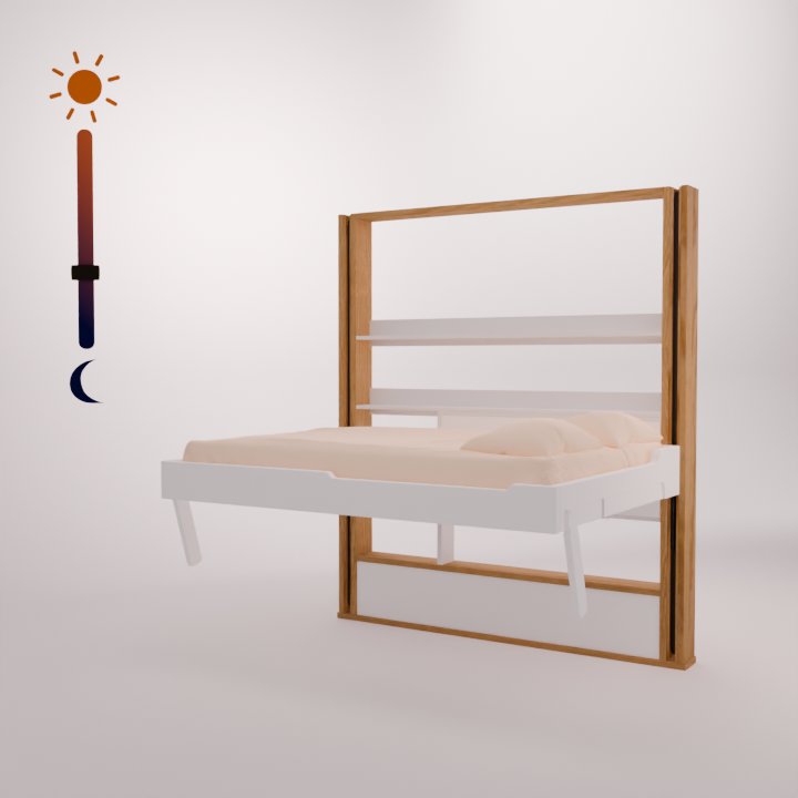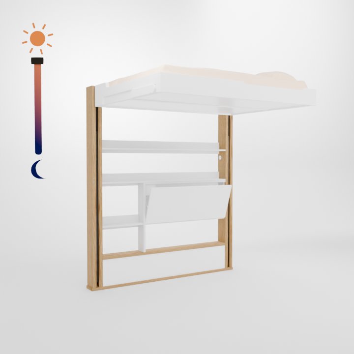Une fois relevé, le lit escamotable éclectique libère un espace au sol entièrement modulable. Cette surface dégagée peut accueillir un bureau, un coin lecture, un espace jeux ou un canapé selon vos besoins. Grâce à sa conception polyvalente, il permet de transformer une même pièce en espace multifonction sans compromis sur le confort.