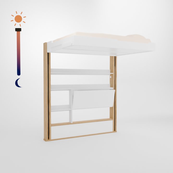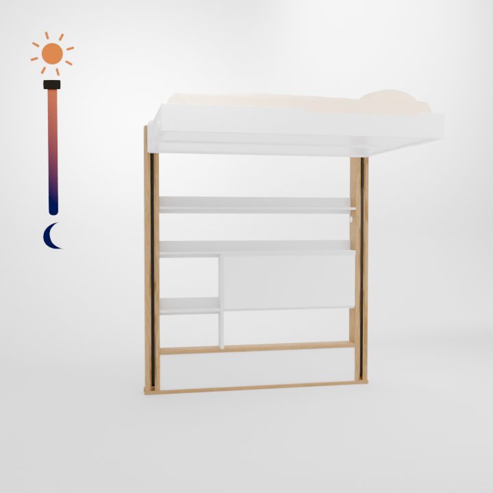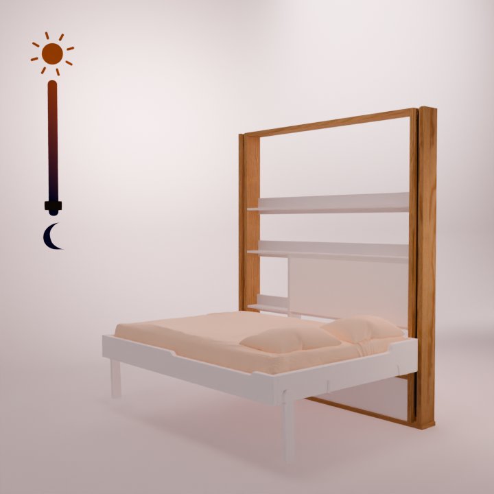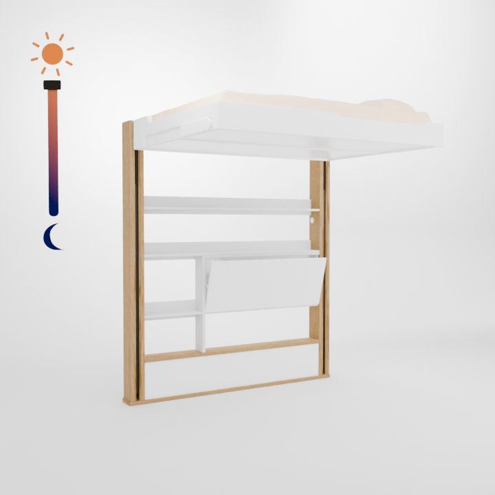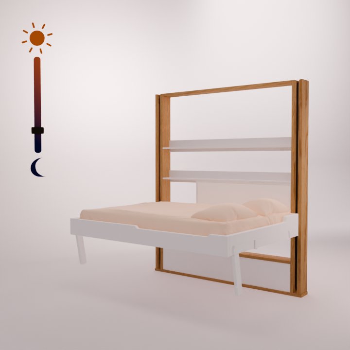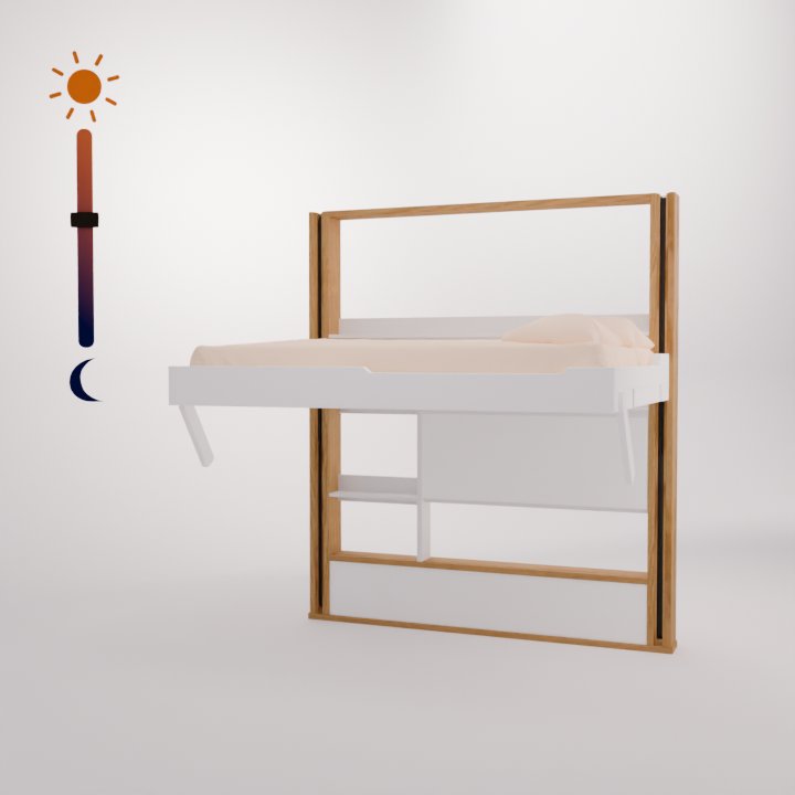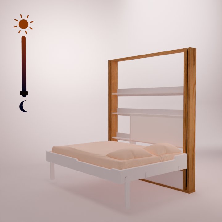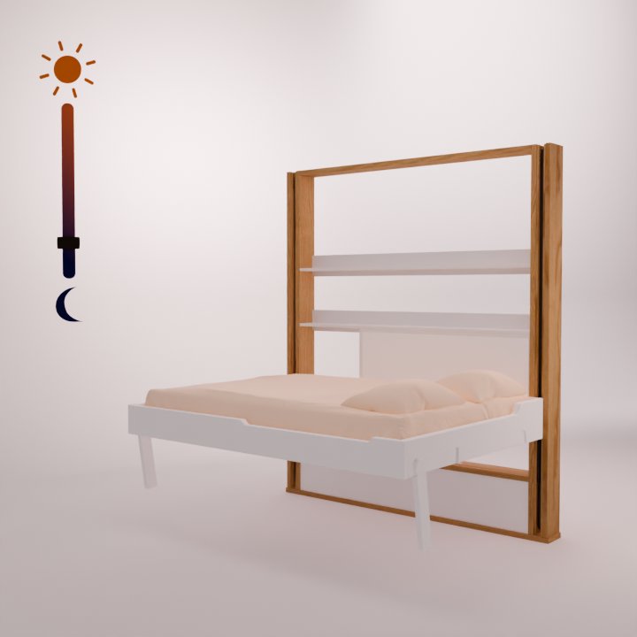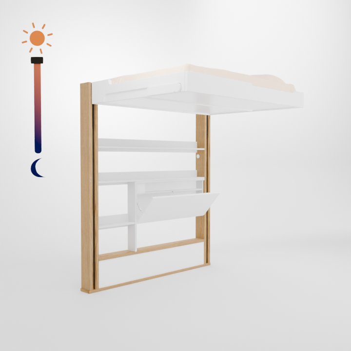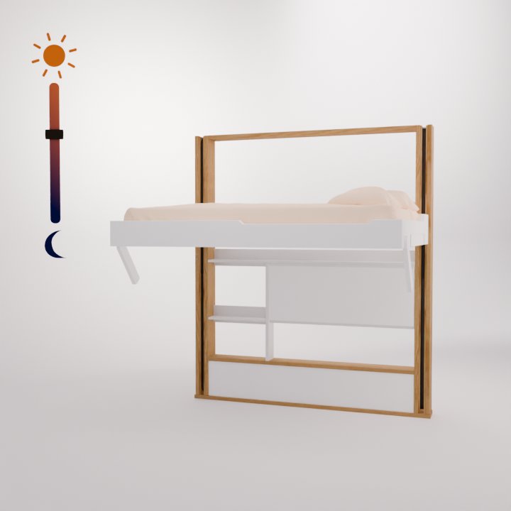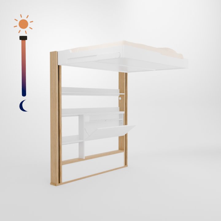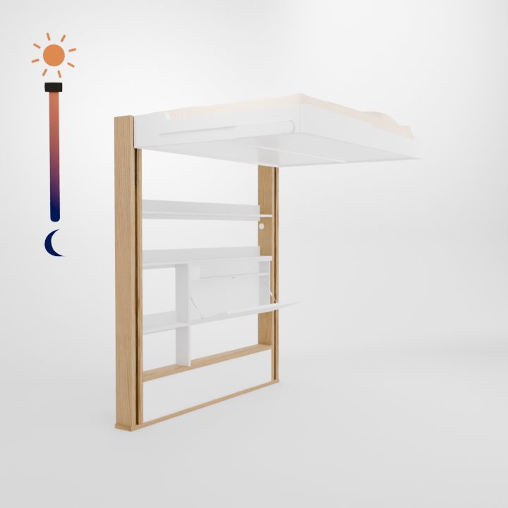 Une fois relevé, le lit escamotable éclectique libère un espace au sol entièrement modulable. Cette surface dégagée peut accueillir un bureau, un coin lecture, un espace jeux ou un canapé selon vos besoins. Grâce à sa conception polyvalente, il permet de transformer une même pièce en espace multifonction sans compromis sur le confort.