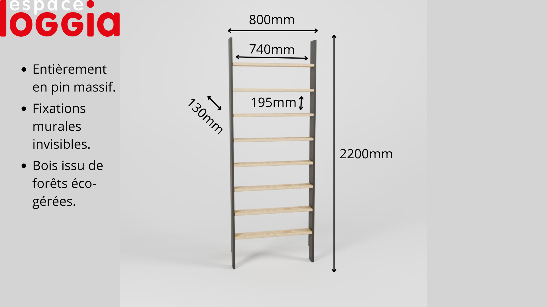 Les étagères Espace Loggia sont conçues pour allier esthétique et fonctionnalité, dans une logique d’optimisation d’espace. Pensées pour les petits appartements, les chambres d’enfants, les studios ou les espaces de travail compacts, elles offrent des solutions de rangement intelligentes sans encombrer le sol. Modulables et personnalisables, ces étagères murales ou autoportantes peuvent être installées seules ou intégrées à des compositions plus complexes (mezzanines, bibliothèques, coins bureau). Leur design épuré, leurs lignes droites et leurs finitions soignées s’adaptent à tous les styles d’intérieur. Que ce soit pour ranger des livres, exposer des objets déco ou organiser un espace de travail, elles répondent à toutes les attentes. Idéales pour créer des zones fonctionnelles bien structurées, ces étagères sont une alternative élégante aux meubles imposants.