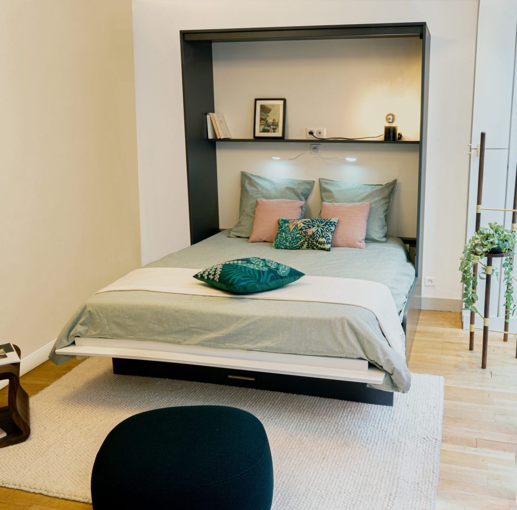 Gain de place optimal : le lit se replie en armoire pour libérer un espace fonctionnel.