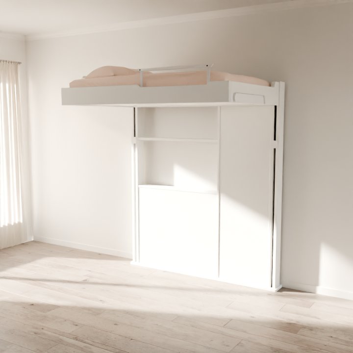 L’espace inférieur est totalement modulable et peut accueillir un bureau, une banquette ou des rangements malins. Vous composez vous-même l’aménagement qui correspond à vos besoins et à votre style de vie.