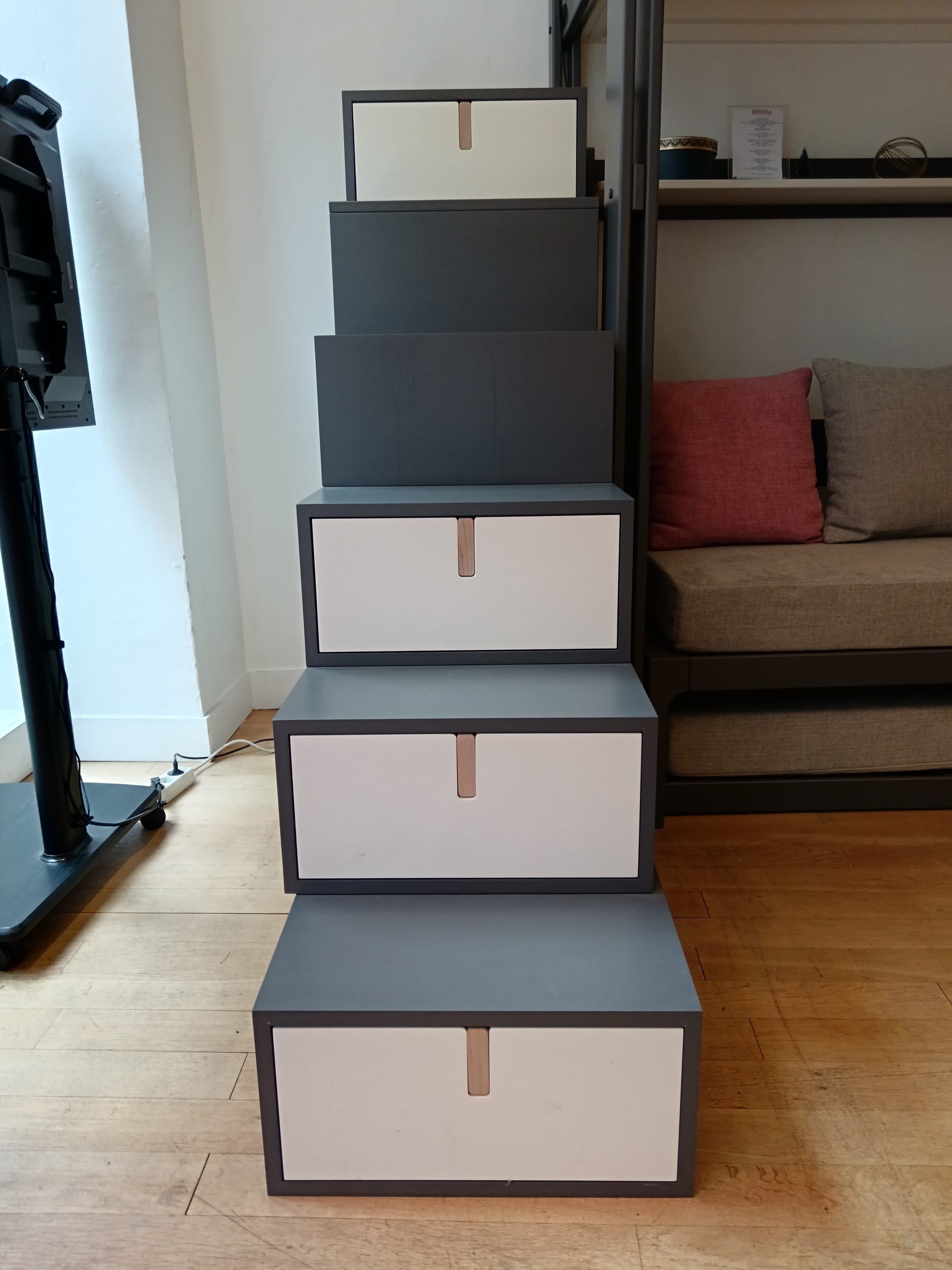 Ce grand escalier Brick L48 x H144cm x Prof168 cm ( comprenant 5 blocs tiroirs ouverture bobinette + 2 demis casiers + armoire penderie) vous offrira un accès confortable et du rangement.