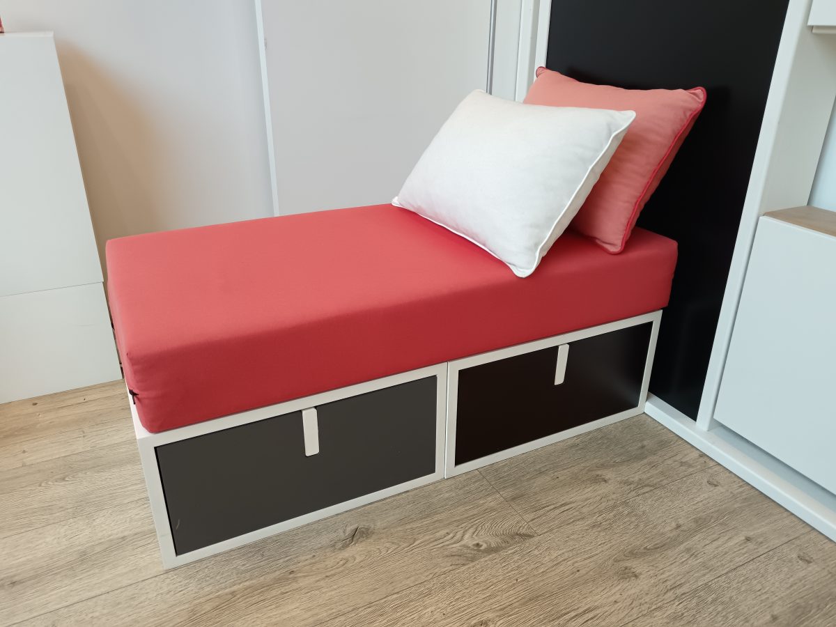 Cette petite banquette Brick 96 x 48 cm ( comprenant 2 bricks tiroir blocs et ouvertures bobinette Blanc 1 tiroir gris Basalte et 1 tiroir bossé/chocolat, matelas assise 96×48 avec housse rouge et 2 coussins 50×35 cm coloris blanc et rouge ) vous offrira une assise d’appoint et du rangement.