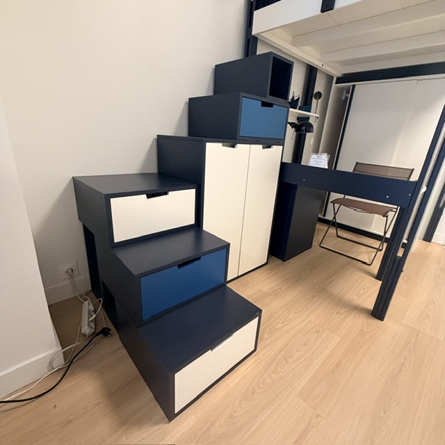 Cet escalier Brick avec rangement à petit prix L48 x H144 x Prof144 cm, ici présenté en (vue de face) largeur 120cm x hauteur 144cm x prof 96cm ( comprenant 4 blocs tiroirs ouverture asymétrique coloris nuit avec tiroirs en blanc et saxe + 1 casiers nuit + 2 demis casiers nuit ) vous offrira un accès confortable et du rangement.